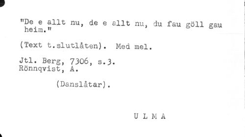 //// "De e allt nu, de e allt nu, du fau göll gau //// heim." //// } //// (Text t.slutlåten). Med mel. //// Jtl. Berg, 7306, s.3. //// Rönnqvist, A. //// i //// (Danslåtar). //// i //// ) //// U L M A ////
