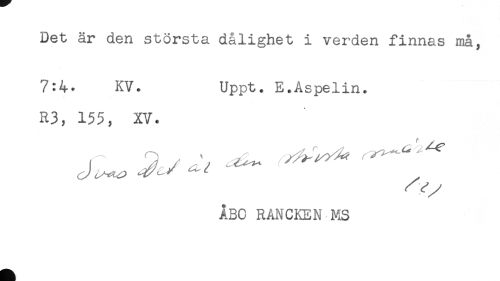 //// Det är den största dålighet i verden finnas må, //// 7:4. KV. Uppt. E.Aspelin. //// R3, 155, XV. //// ABC RANCKEN MS ////