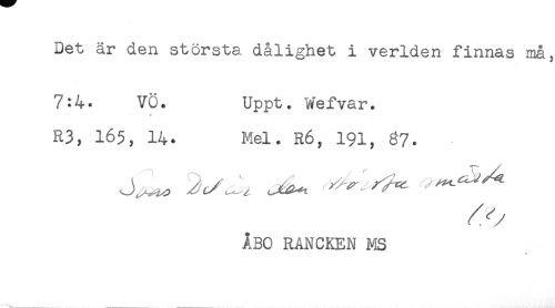 //// Det är den största dålighet i verlden finnas må, //// 7:4. VO. Uppt. Wefvar. //// * //// R3, 16$, 14. Mel. R6, 191, 67. //// ÅBO RANCKEN MS ////