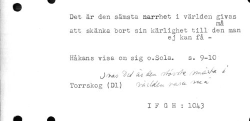 //// Det är den sämsta narrhet i världen givas //// må //// ! att skänka bort sin kärlighet till den man //// ej kan få - //// Håkans visa om sig o.Sola. s. 9-10 //// f //// Torrskog (Dl) ^^ ^ ^ //// * //// I F G H : 1043 ////