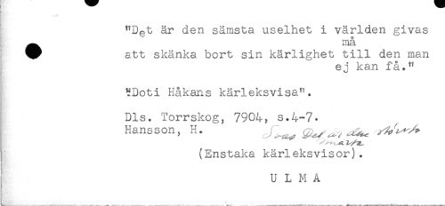 //// BK //// "D^t är den sämsta useihet i världen givas //// ^ må //// att skänka bort sin kärlighet till den man //// ej kan få." //// ^Doti Håkans kärleksvisa". //// Dis. Torrskog, 7904, s.4-7* //// Hansson, H. - ^ ^^ ^ ^^ //// (Enstaka kärleksvisor). //// A'; //// U L M A ////
