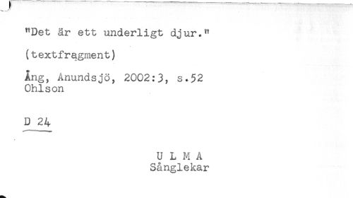 //// __ //// "Det är ett underligt djur." //// (textfragment) //// Ang, Anundsjö, 2002:3, s.52 //// Ohlson //// D 24 //// U L M A //// Sånglekar ////