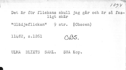 //// i /^y //// Det är för flickans skull jag går och är så fas- //// ligt skär //// , . t //// "Glädjeflickan" 9 str. {Obscen) //// i //// 11482, s.1261 oRs //// * i //// ! //// i //// ULMA BLIXTS SAML. SVA Kop. ////