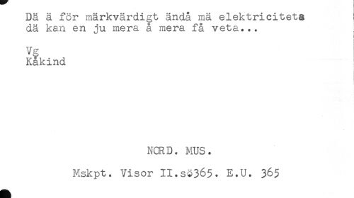 //// Dä ä för märkvärdigt ändå mä elektricitets //// dä kan en ju mera å mera få veta... ] //// ! //// ! //// i //// Vg //// Kåkind //// NCRD. MUS. //// Mskpt. Visor II.s3365. E.U. 365 ////