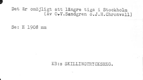 //// Det är omöjligt att längre tiga i Stockholm //// (Av O^V.Sandgren o.J.H.Chronvall) //// Se: E 1903 mm //// ! //// KB:s SKILLINGTRYCKSREG. ////