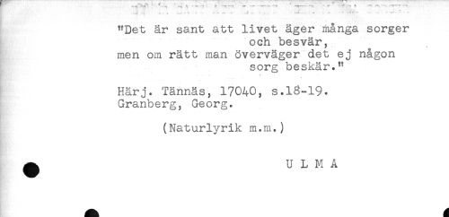 //// "Det är sant att livet äger många sorger //// och besvär, //// men om rätt man överväger det ej någon //// sorg beskär." //// v . . - - 3 . " //// Härj. Tännäs, 17040, s.18-19* //// Granberg, Georg. //// (Naturlyrik m.m.) //// ^ U L M Å ////