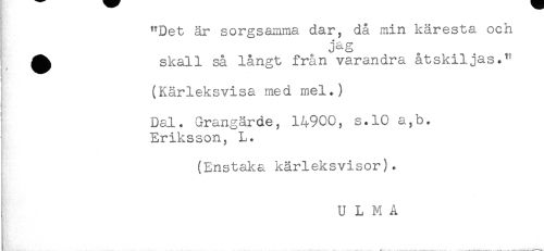//// "Det är sorgsamma dar, då min käresta och //// ! ^ skall så långt från varandra åtskiljas.'' //// j! * ^^^ //// (Kärleksvisa med mel.) //// i //// ^ Dal. Grangärde, 14900, s.10 a,b. //// Eriksson, L. //// . //// (Enstaka kärleksvisor). //// U L M A ////