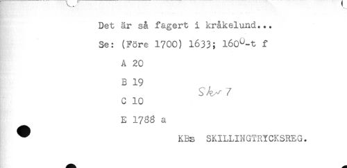 //// Det är så fagert i kråkelund... //// Se: (Före 1700) 1633; 160^-t f //// A 20 //// B 19 //// S //// /c 10 //// E 173g a //// ^ KBs SKILLINGTRYCKSREG. ////
