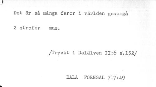 //// Det är så många faror i världen genomgå //// 2 strofer mus. //// /Tryckt i Dalälven 11:6 s.152 //// /DALA FORNSAL 717:49 ////