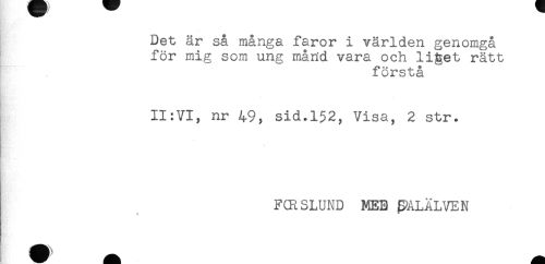 //// Det är så många faror i världen genomgå //// för mig som ung mårid vara och li^et rätt //// förstå //// - //// II:VI, nr 49, sid.152, Visa, 2 str. //// } //// FCRSLUND MEB pALALVEN ////