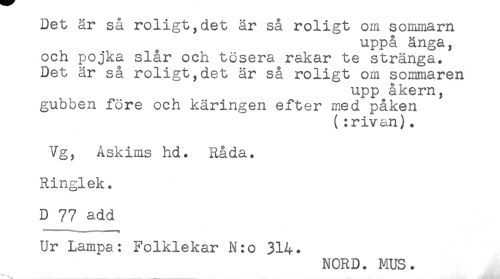 //// Det är så roligt,det är så roligt om sommarn //// uppå änga, //// och pojka slår och tösera rakar te stränga. //// Det är så roligt,det är så roligt om sommaren //// upp åkern, //// gubben före och käringen efter med påken //// (:rivan). //// Vg, Askims hd. Råda. //// Ringlek. //// D 77 add //// ' """ ". " ' w //// Ur Lampa: Folklekar N:o 314. //// NORD. HUS. //// * ////