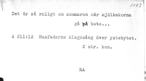 //// - ....... ...... . ^^^ //// Det är så roligt om sommaren när mjölkekorna //// gå Ipå bete... //// t //// A 211:12 Husfaderns klagosång över ystebytet. //// 2 str. kom. //// RA ////