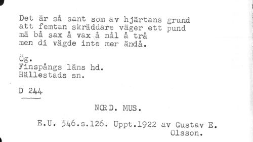 //// f //// Det är så sant som av hjärtans grund //// att femtan skräddare väger ett pund ! //// mä bå sax å vax å nål å trå //// men di vägde inte mer ändå. //// i //// cg. //// Finspångs läns hd. //// Hällestads sn. //// D 244 //// N(RD. MUS. //// E.U. 546.s.126. Uppt.1922 av Gustav E. //// Olsson. //// t ////