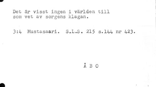 //// Det är visst ingen i världen till //// som vet av sorgens klagan. //// 3:4 Mustasaari. S.L.S. 21$ s.144 nr 423* //// ÅBO ////