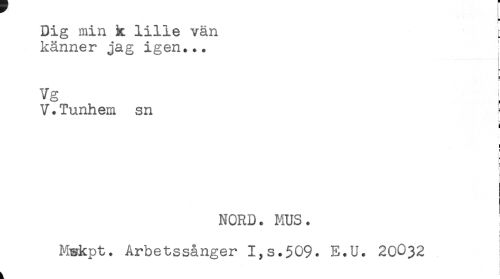 //// Dig min k lille vän L //// känner jag igen... ; //// Vg //// V.Tunhem sn ^ //// i //// t //// f //// NORD. MUS. //// ! //// r //// M^kpt. Arbetssånger I,s.$09. E.U. 20O32 ////