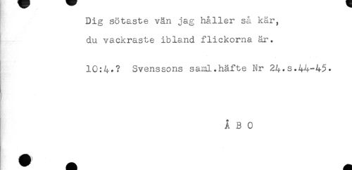 //// Dig sötaste vän jag håller så kär, //// du vackraste ibland flickorna är. //// 10:4.? Svenssons saml.häfte Nr 24.s.44-45. //// ÅBO ////