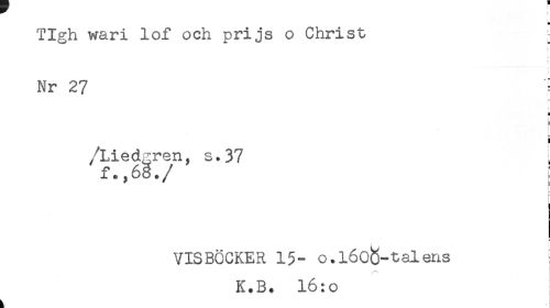 //// TIgh wari lof och prijs o Christ [ //// c //// t //// Nr 27 = //// r— //// * //// = //// ! //// /Lied^ren, s. 37 //// t* //// VISBÖCKER 15- O.l6ob-talens //// K.B. l6:o //// å -i ////