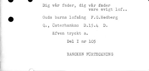 //// Dig var fader, dig vår fader //// vare evigt lof.. //// ^ Guds barns lofsång F.G.Hedberg //// Q., Csterhankmo D.15.4 D. //// . äfven tryckt s. //// Del I nr 105 //// RANCKEN FÖRTECKNING //// < ////
