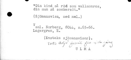 //// "Din kind sa röd som vallmonros, //// din mun så sockersöt." //// ^ (Sjömansvisa, med mel.) //// V //// sml. Norberg, ^044, s.65-66. //// Lagergren, E. //// (Enstaka sjömansvisor). //// U L M A ^ ////