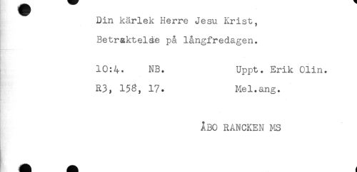 //// Din kärlek Herre Jesu Krist, //// Betraktelse på långfredagen. //// 10:4- NB. Uppt. Erik Clin. //// R3, 158, 17^ Mel.ang. //// ÅBO RANCKEN MS ////