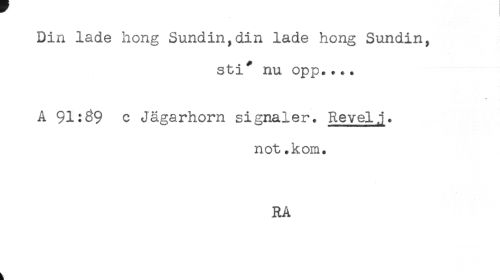 //// Din lade hong Sundin,din lade hong Sundin, //// sti^ nu opp.... //// A 91:39 c Jägarhorn signaler. Revelj. //// not.kom. //// RA ////