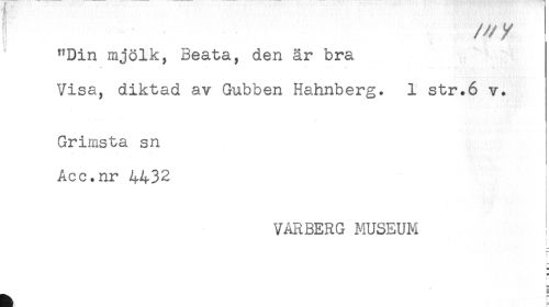 //// "Din mjölk, Beata, den är bra //// * . - . . - - - -. . ^ . . //// Visa, diktad av Gubben Hahnberg. 1 str.6 v. //// Grimsta sn //// Acc.nr 4432 //// VÅRBERG MUSEUM //// t— //// i ////