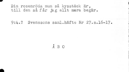 //// Din rosenröda mun så kysstäck är, //// till den så får jag allt mera begär. ! //// r //// 9:4.? Svenssons saml.häfte Nr 27.s.16-17. //// ÅBO //// t //// } //// t ////