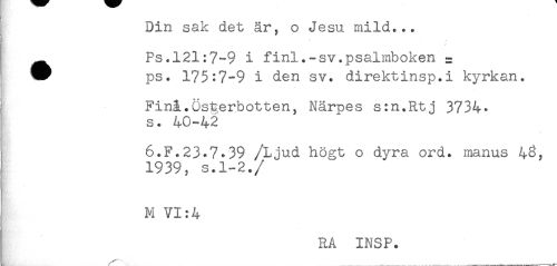 //// Ps.121:7-9 i finl.-sv.psalmboken = //// V ps. 175:7-9 i den sv. direktinsp.i kyrkan. //// Finå.Österbotten, Närpes s:n.Rtj 3734* //// s. 40-42 //// 6.F.23.7-39 /Ljud högt o dyra ord. manus 48, //// 1939, s.1-2. //// /M VI:4 //// RA INSP. //// _____....— ////