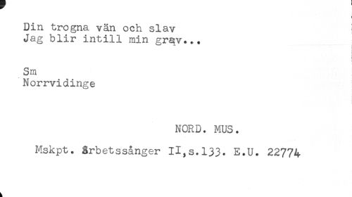 //// Din trogna vän och slav //// Jag blir intill min grqv... //// c //// ! //// ! //// c //// Sm //// Norrvidinge //// t //// NORD. MUS. //// Mskpt. Srbetssånger II,s.133. E.U. 22774 //// k ////