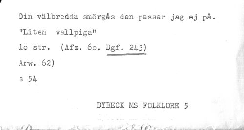 //// Din välbredda smörgås den passar jag ej på. //// "Liten vallpiga" //// lo str. (Afz. 60. Dgf. 243) //// Arw. 62) //// s 54 //// DYBECK MS FOLKLORE 5 //// L___...A. i Yl___ ___ ////