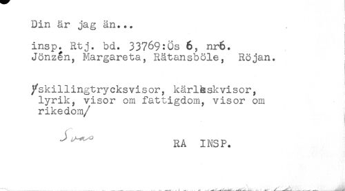 //// insp* Rtj. bd. 33?69:Os 6, nr6. //// Jönzen, Margareta, Rätansböle, Röjan. //// i //// < //// /skillingtrycksvisor, kärläskvisor, //// lyrik, visor om fattigdom, visor om //// rikedom //// /^^ RÅ INSP. ////