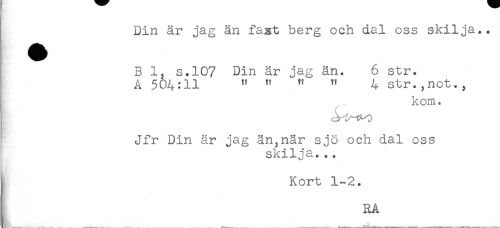 //// B 1, s.107 Din är jag än. 6 str. //// A 504:11 " " " " 4 str.,not., //// r .. kom. //// Jfr Din är jag än,när sjö och dal oss //// skilja.., //// Kort 1-2. ////
