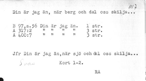 //// <t . ...... //// B 97,s.56 Din är jag än. 1 str. //// A 317:2 " " " " 3 str. //// A 400:7 " " " " 3 str. //// Jfr Din är jag än,när sjö ochcal oss skilja... //// j ^^ Kort 1-2. //// RA //// = //// * //// — ////