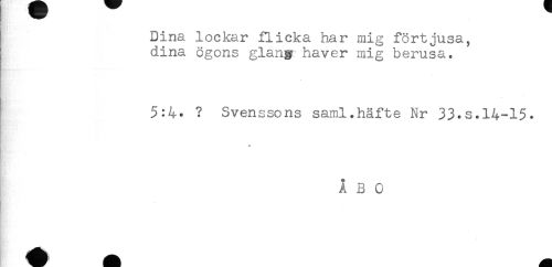 //// Dina lockar flicka har mig förtjusa, //// dina ögons glan# haver mig berusa. //// 5:4- ? Svenssons saml.häfte Nr 33*s.14-15. //// * //// ÅBO ////