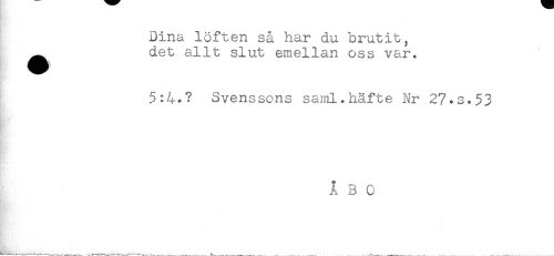 //// Dina löften så har du brutit, //// det allt slut emellan oss var. //// 5:4+? Svenssons saml.häfte Nr 27.S.53 //// Å B 0 ////