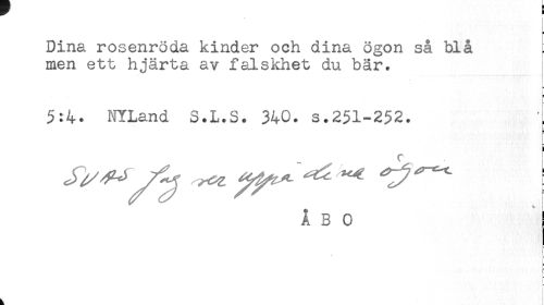 //// Dina rosenröda kinder och dina ögon så blå //// men ett hjärta av falskhet du bär. //// . //// F //// 5:4. NYLand S.L.S. 340. s.251-252. //// P //// r ; //// ÅBO l //// ] //// ) //// ) //// r ////