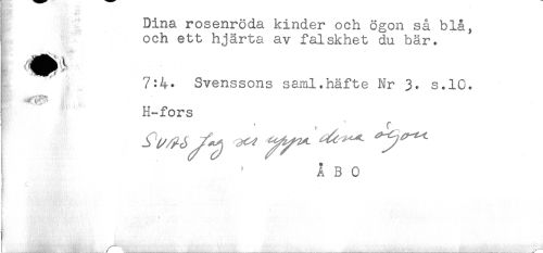 //// Dina rosenröda kinder och ögon så blå, //// t och ett hjärta av falskhet du bär. //// ^^ 7:4. Svenssons saml.häfte Nr 3. s.10. //// H-fors //// ! 'ÅBO //// f //// : //// r ////