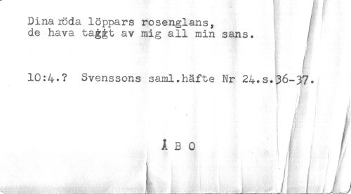 //// Dina röda löppars rosenglans, //// de hava taggt av mig all min sans. //// HHB //// ! //// /10:4.? Svenssons saml.häfte Nr 24.s.36-37. //// ! F ' ^ //// s n' # //// ÅBO ; //// ty (% . K , # ////