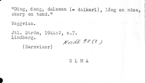 //// "Ding, dang, dalaman (- dalkarl), lång en näsa, ! //// skarp en tand." //// i //// Vaggvisa. //// Jtl. Ström, 1944:2, s.7. //// Lindberg. //// (Barnvisor) //// U L M A ////