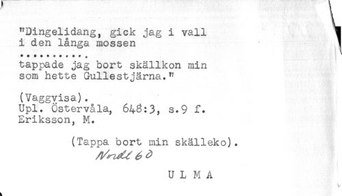 //// \ //// "Dingelidang, gick jag i vall n //// i den långa mossen 1 //// tappade jag bort skälikon min //// som hette Gullestjärna.'? //// (Vaggvisa). //// Upl* Cstervåla, 64^:3, s.9 f* //// Eriksson, M. //// (Tappa bort min skälleko). ////