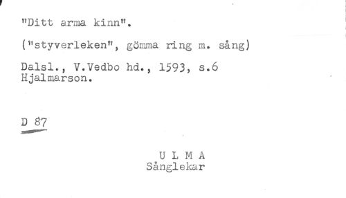 //// "Ditt arma kinn". //// ! //// I //// (**styverleken"; gömma ring m. sång) //// Dalslt, V.Vedbo hd., 1593, s.6 //// Hjalmarson. //// D 37 ////