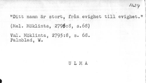 //// .... - - - < - - - . T - - . ' ' .... ' - ' „ //// * //// "Ditt namn är stort, från evighet till evighet." //// - -- < . . ' v. //// (Mel. Möklinta, 27%:s.68) //// . ... .. .. <- - . ^ //// . - s . - , : //// < //// Vml. Möklinta, 2795:6, s. 68. //// Palmblad, W. //// U L M A //// - //// t //// ! //// < //// i //// ) ////