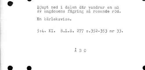 //// Djupt ned i dalen där vandrar en mö //// Av ungdomens fägring så rosande röd. //// En kärleksvisa. //// 5:4- Kl. S.L.S. 277 s.352-353 nr 33- //// ÅBO ////