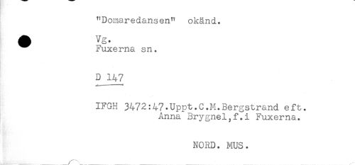 //// "Domaredansen" okänd. //// ^^ Fuxerna sn. //// D 147 //// IFGH 3472:47^Uppt.C.M.Bergstrand eft. //// Anna Brygnel^f.i Fuxerna. //// NORD. MUS. //// ___ ____....... ////