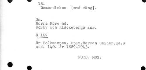 //// -LO . //// Domareleken (med sång{. //// Sm. //// Norra Möre hd. //// Dörby och Kläckeberga snr. //// DJL47 //// Ur Folkminnen. Uppt.Herman Geijer.Bd.9 //// sid. 140. År 1669-1943. //// NORD. MUS. ////