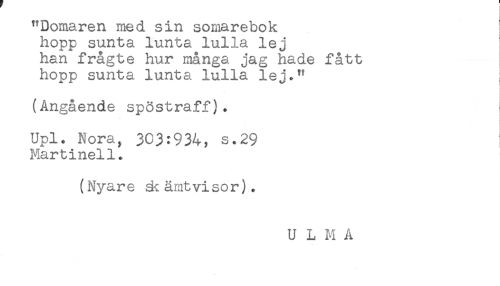//// "Domaren med sin somarebok //// hopp sunta lunta lulla lej //// han frågte hur många jag hade fått //// hopp sunta lunta lulla lej." //// t //// i //// (Angående spöstraff). //// Upl. Nora, 303:934, s.29 //// Martinell. //// (Nyare & ämtvisor). //// U L M A ////