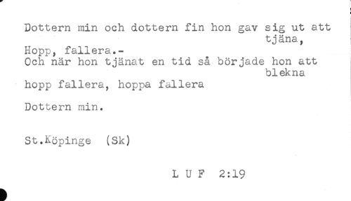 //// Dottern min och dottern fin hon gav sig ut att //// tjäna. //// Hopp, fallera.- //// Och när hon tjänat en tid så började hon att //// blekna //// hopp fallera, hoppa fallera //// Dottern min. //// St.Köpinge (Sk) //// L U F 2:19 //// t ////
