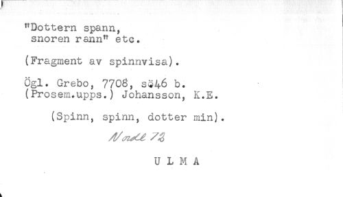 //// ..- - //// "Dottern spann, //// snören rann" etc. //// (Fragment av spinnvisa). //// Cgl. Grebo, 7703, s346 b. ! //// (Prosem.upps.) Johansson, K.E. //// * ^ < //// (Spinn, spinn, dotter min). //// U L M A ////