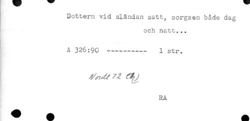 //// * . - . . //// Dottern vid sländan satt, sorgsen både dag //// och natt... //// ' ? ^ * . * . . //// A 326:90 ---- 1 str. //// RA ////