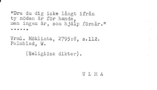 //// "Dra du dig icke långt ifrån //// ty nöden är för hände, //// men ingen är, som hjälp fönxår." //// A. ^^ //// Vrml. Möklinta, 2795:3, s.112. //// Palmblad, W. //// (Religiösa dikter). //// U L M A ////